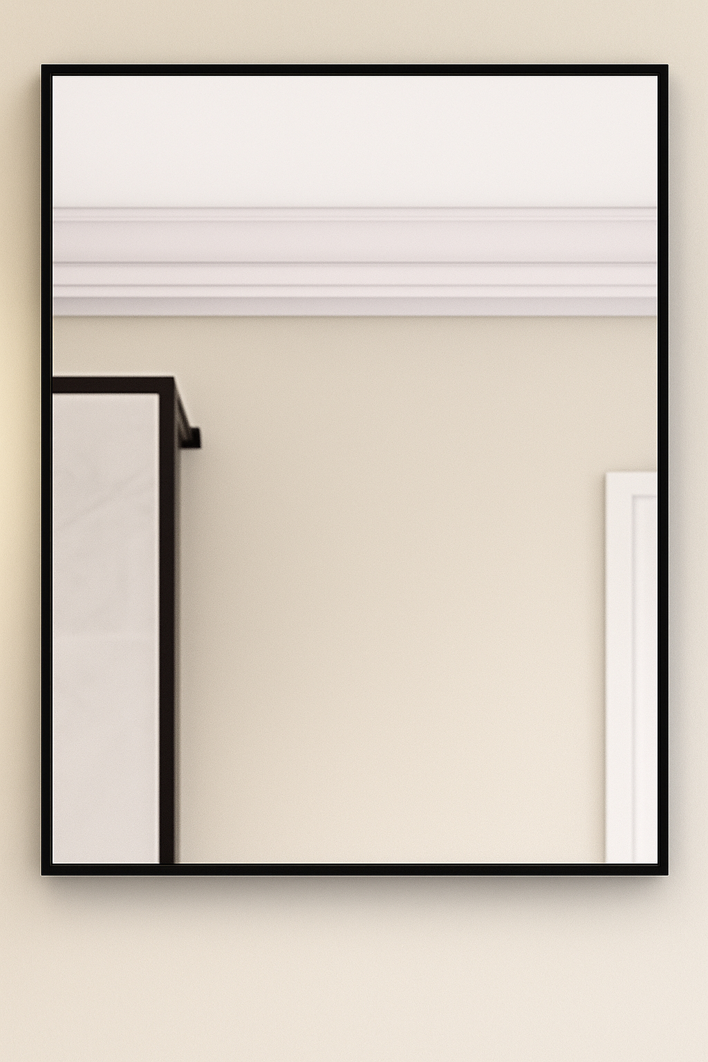 Espelho com moldura e sensor tátil em perfil de alumínio preto mate. Com desembaciador de área efetiva de 600 x 400 mm.