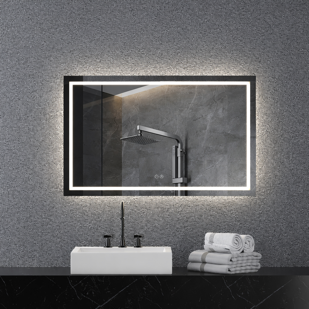 Espelho retangular LED em alumínio com sistema antiembaciamento e botão tátil.