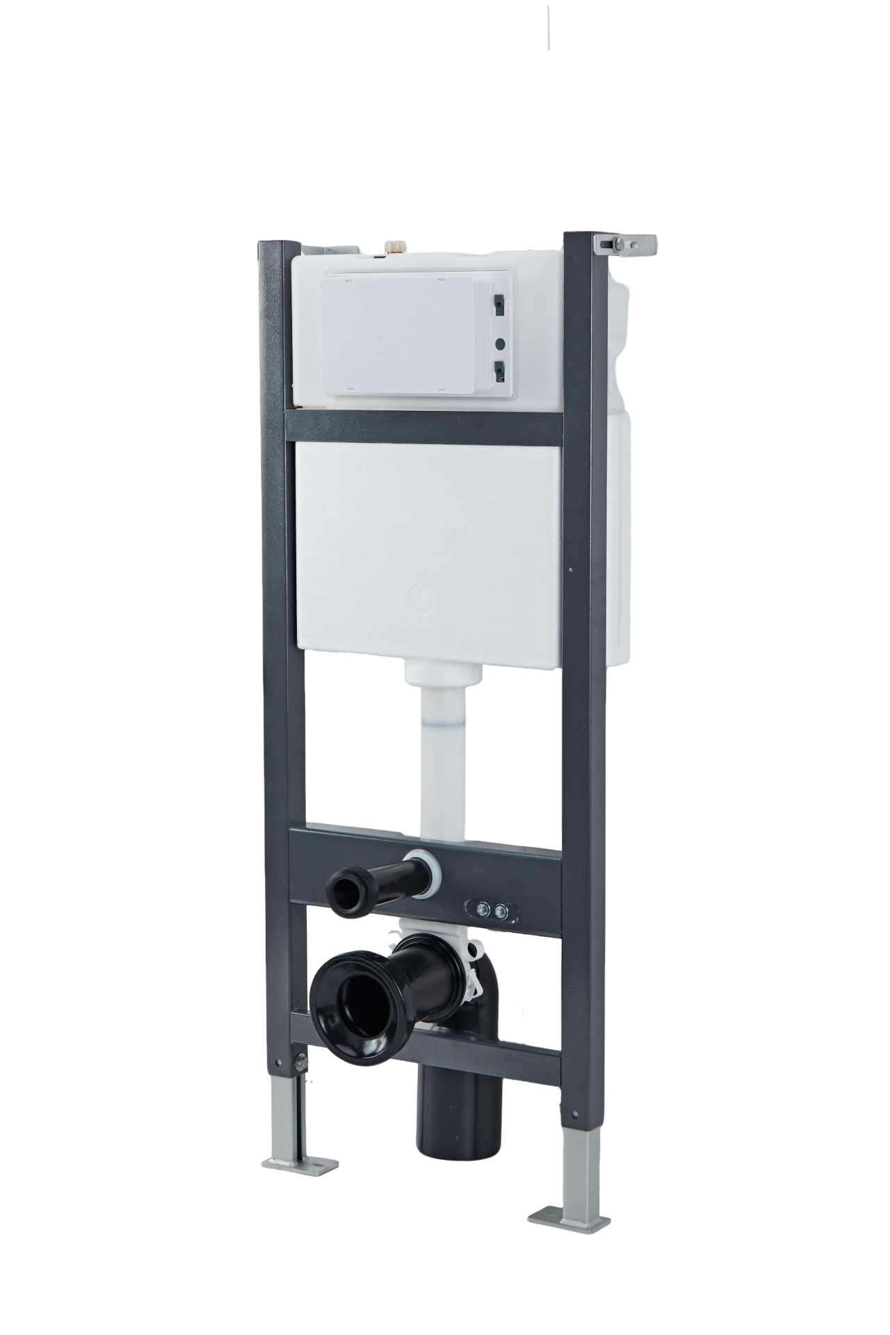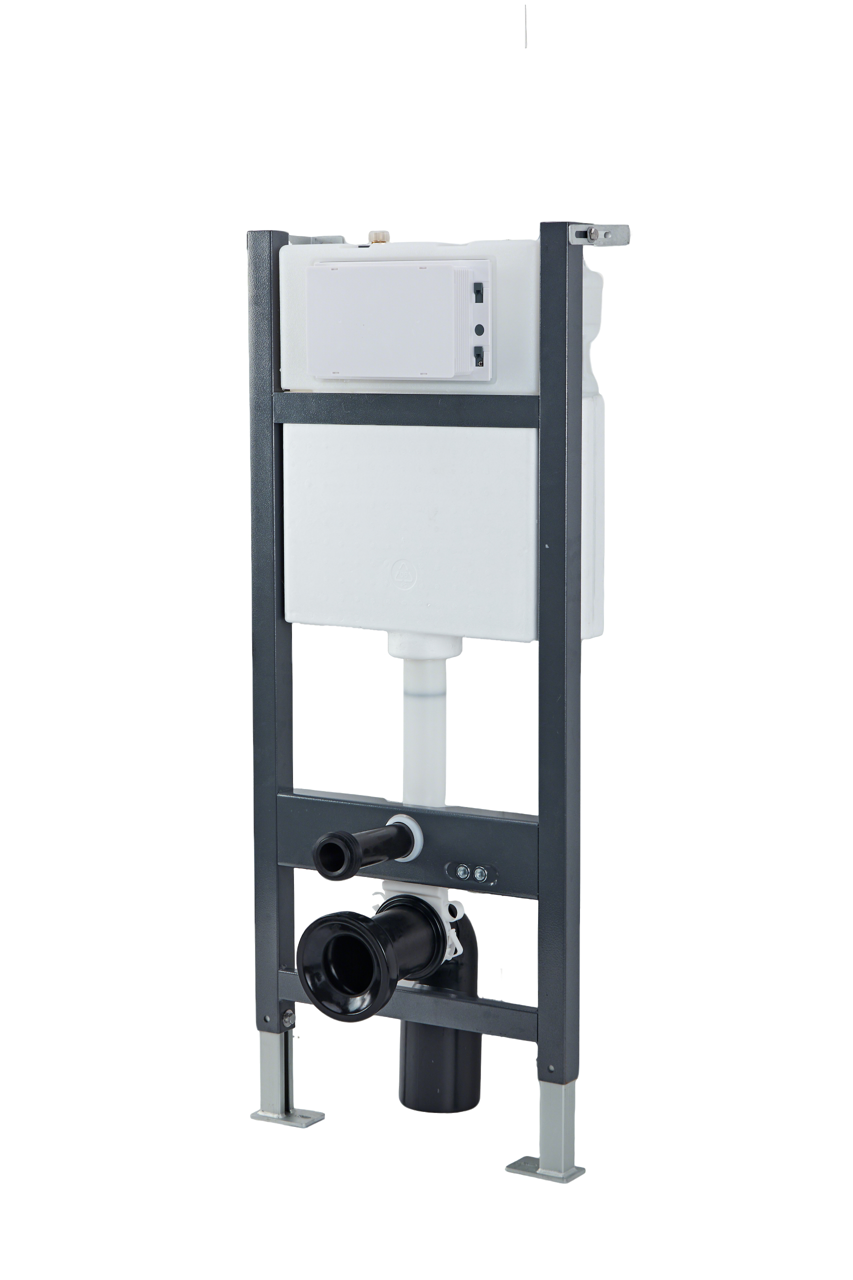 Autoclismo embutido com corpo em plástico HDPE e estrutura metálica revestida com Dacromet antiferrugem. Volume de descarga entre 3 a 7 litros, com válvula angular em cobre, mangueira e tubo de drenagem.