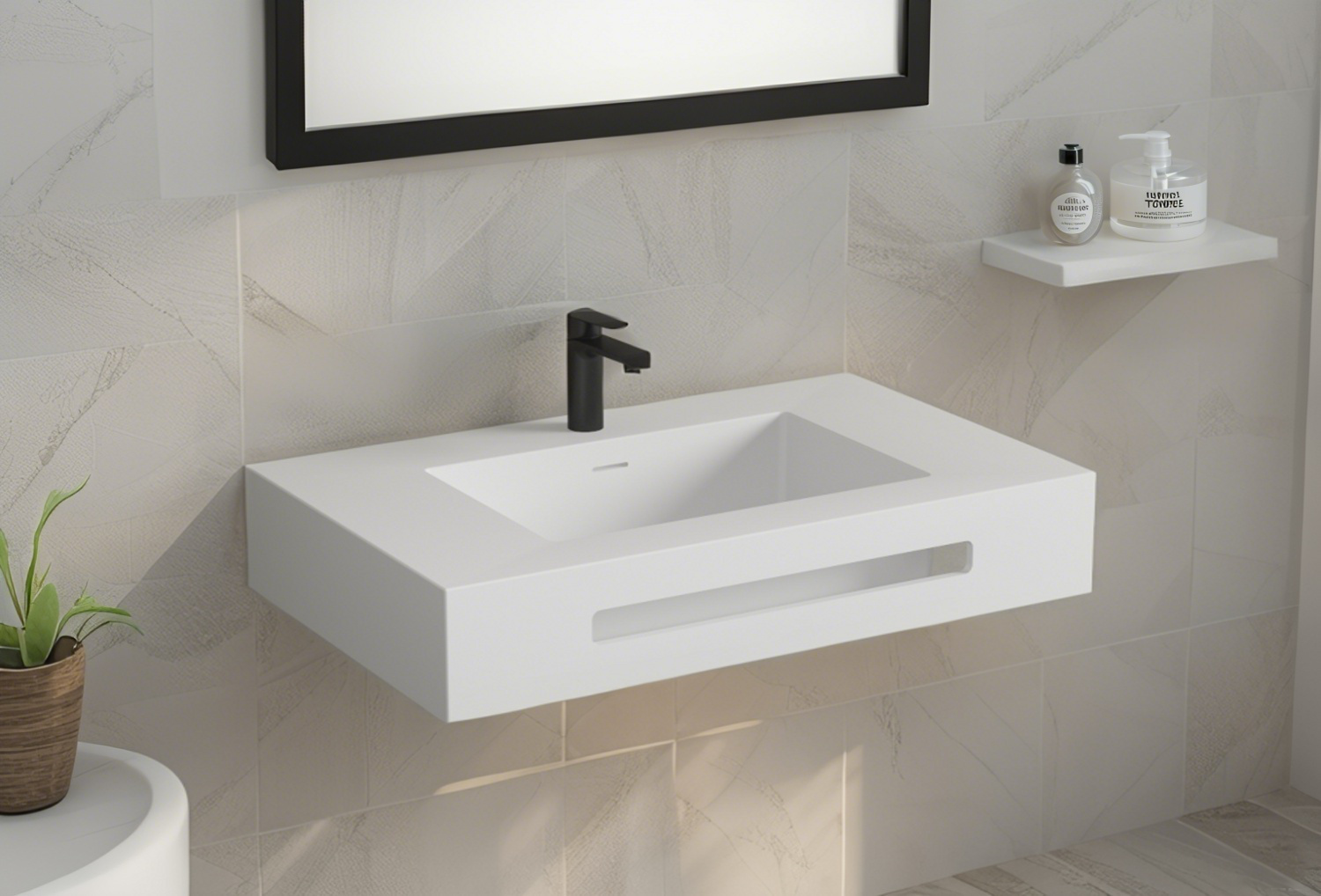 Lavatório suspenso em superfície sólida acrílica composta por resina PMMA e tri-hidrato de alumínio (ATH), de fácil limpeza.