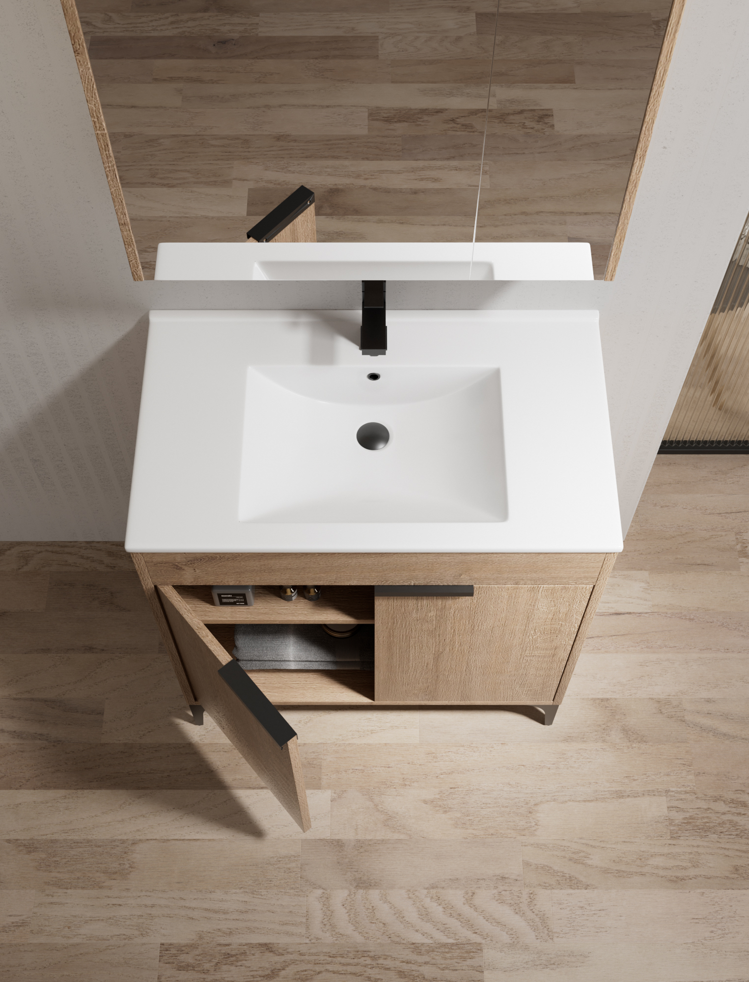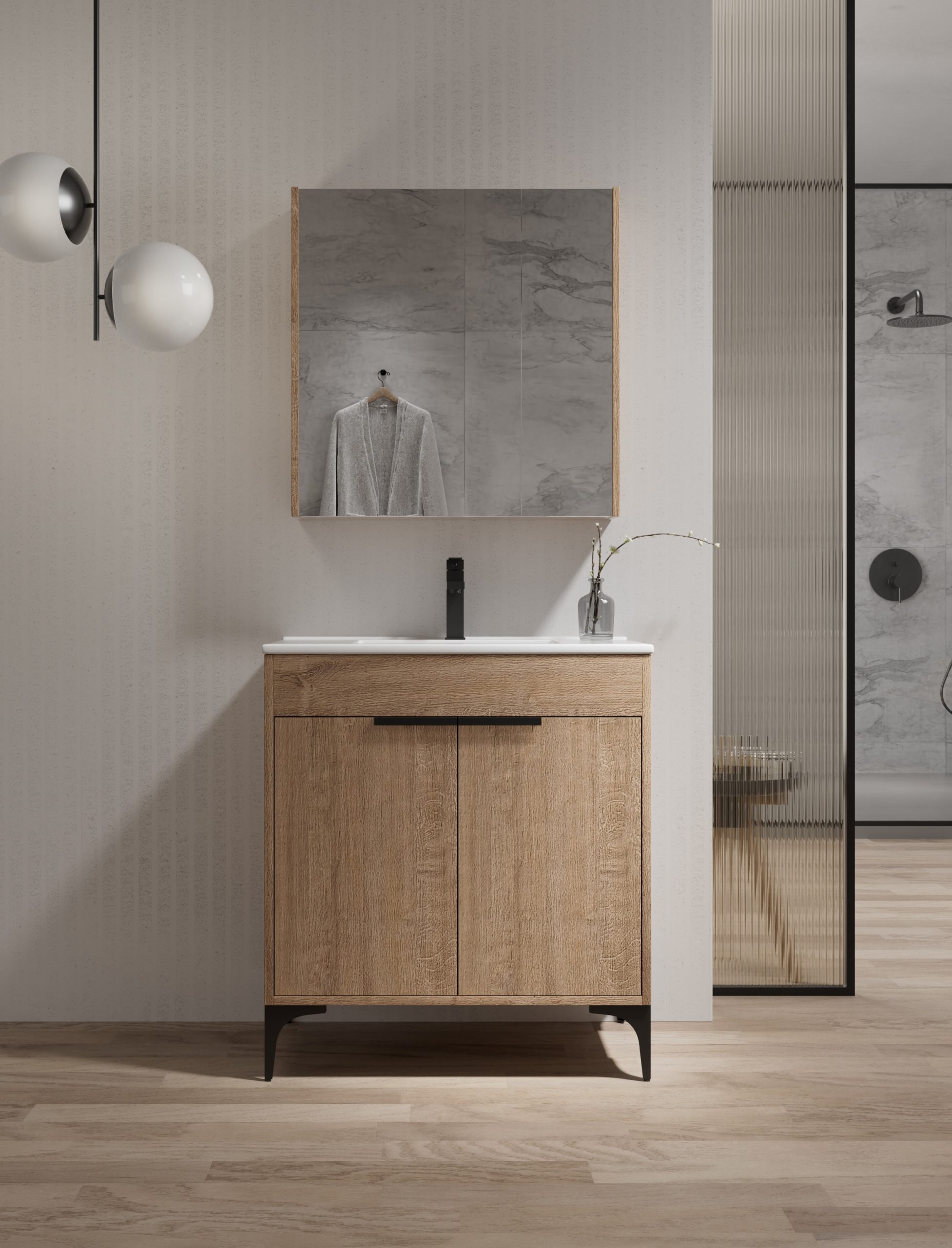 Móvel em MDF com 15mm de espessura com acabamento em melamina madeira natural ou personalizado. As dobradiças e gavetas são equipadas com sistema de fecho suave.