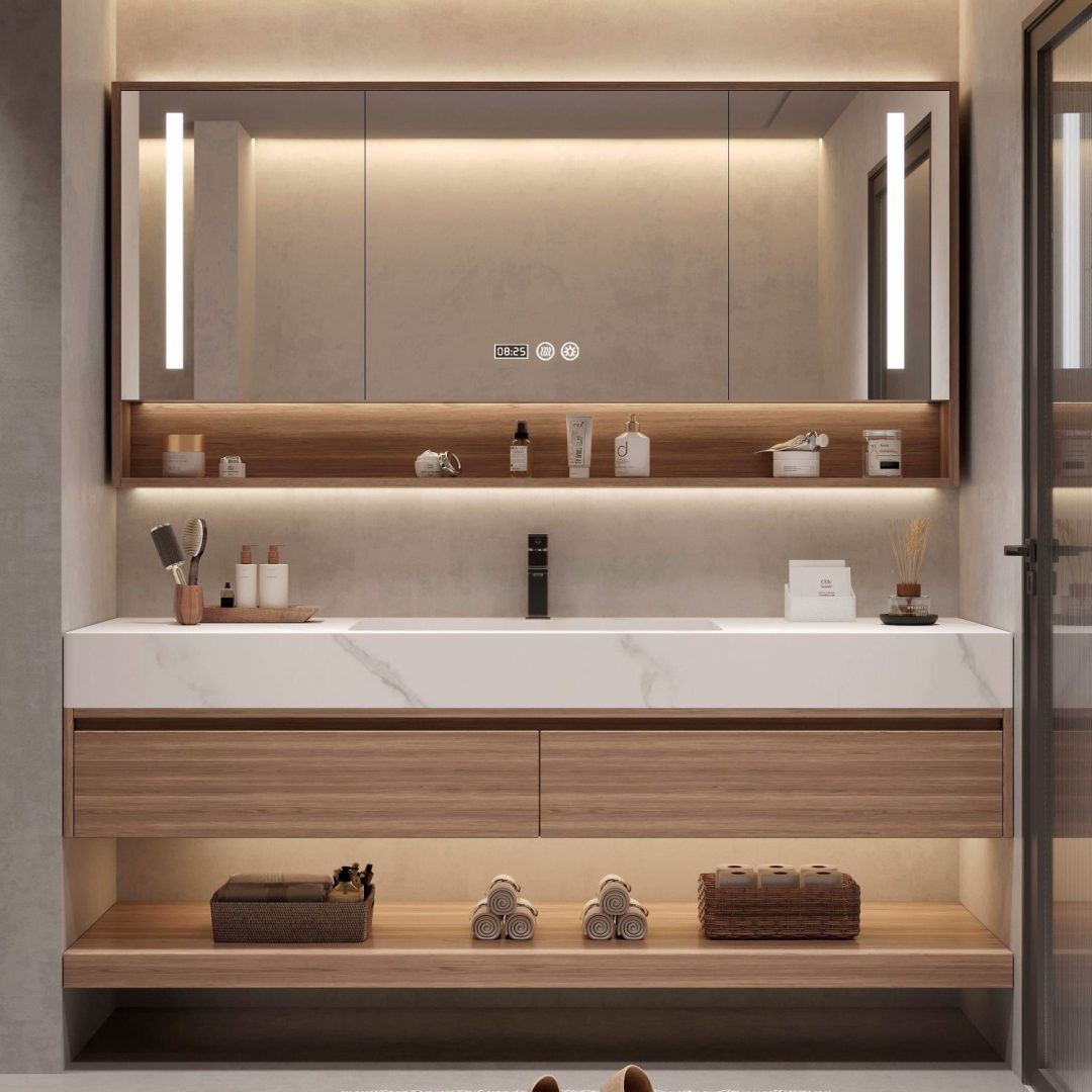 Conjunto composto por armário principal, lavatório em cerâmica e tampo integrado.