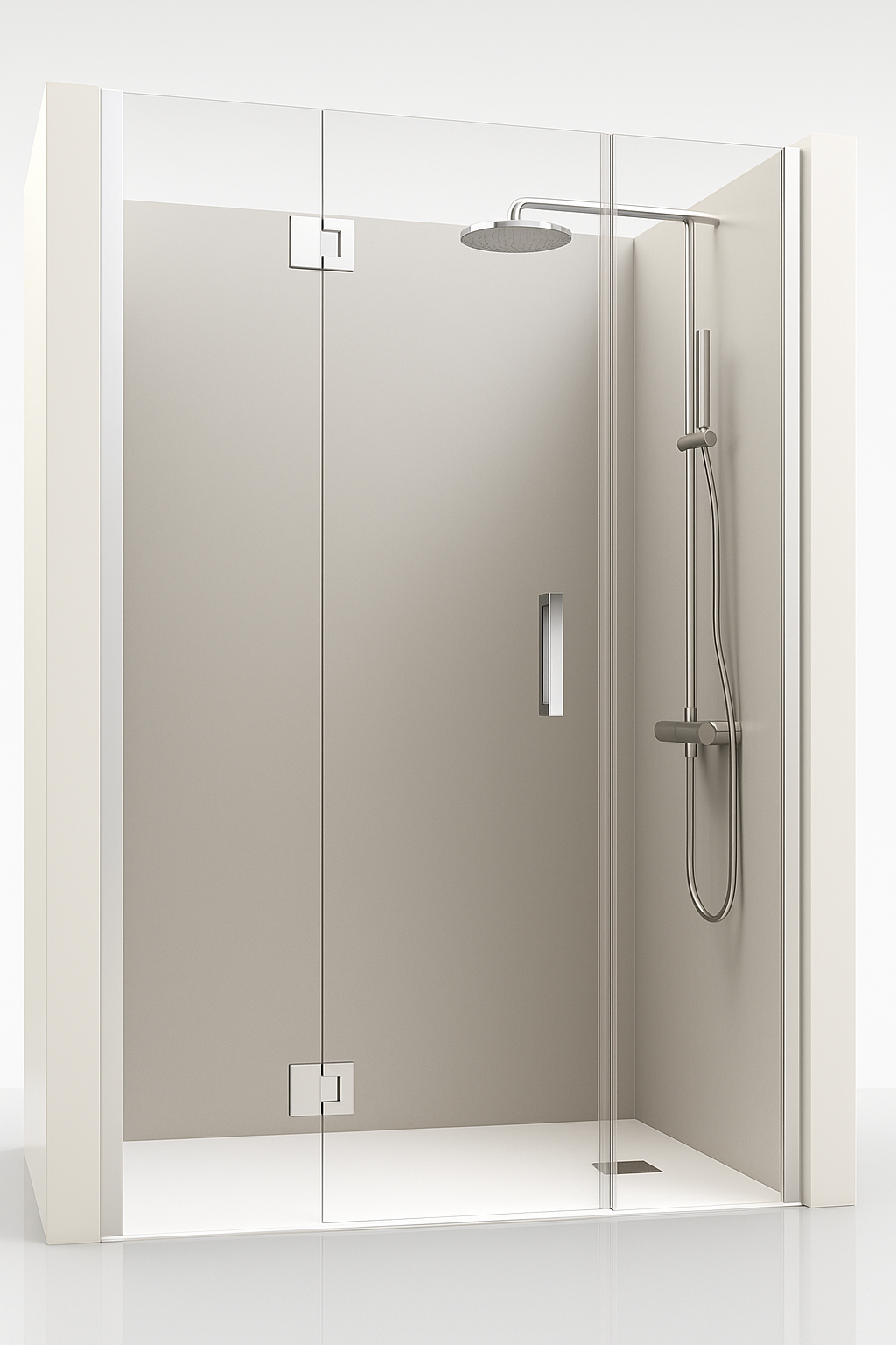 Resguardo de duche com uma porta pivotante e duas fixas equipada com dobradiças em aço inoxidável 304, puxador em liga de zinco e vidro temperado com 8 mm de espessura.