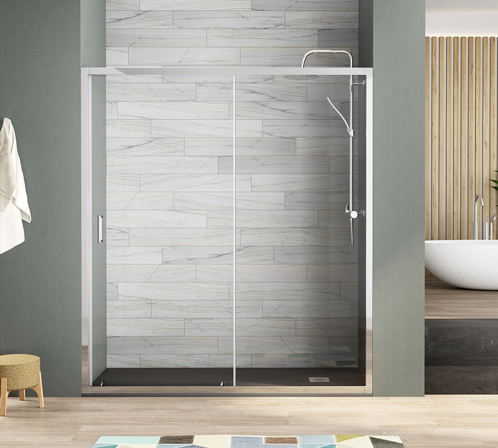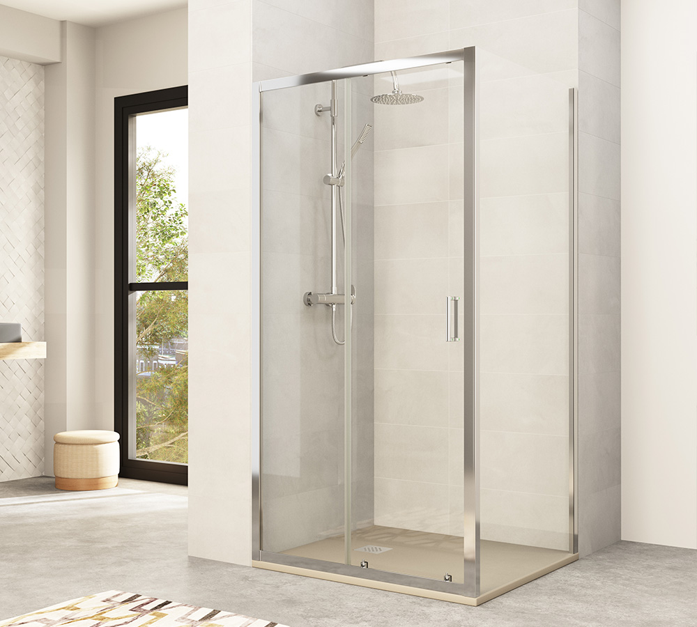 Resguardo de duche com porta de correr que permite otimizar o espaço disponível.