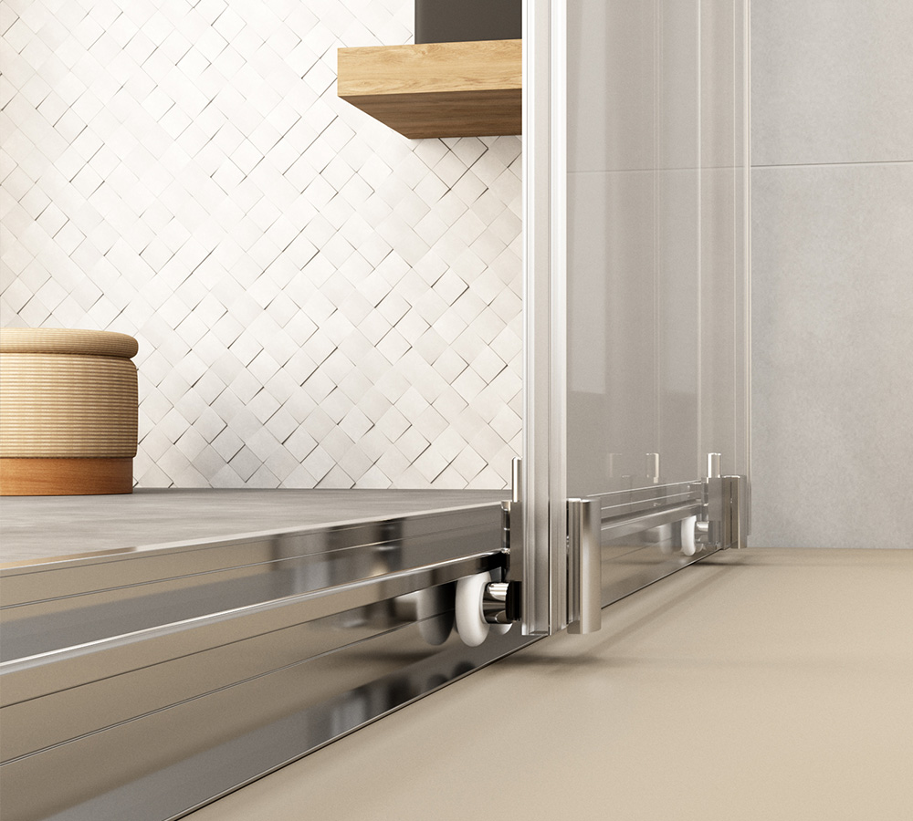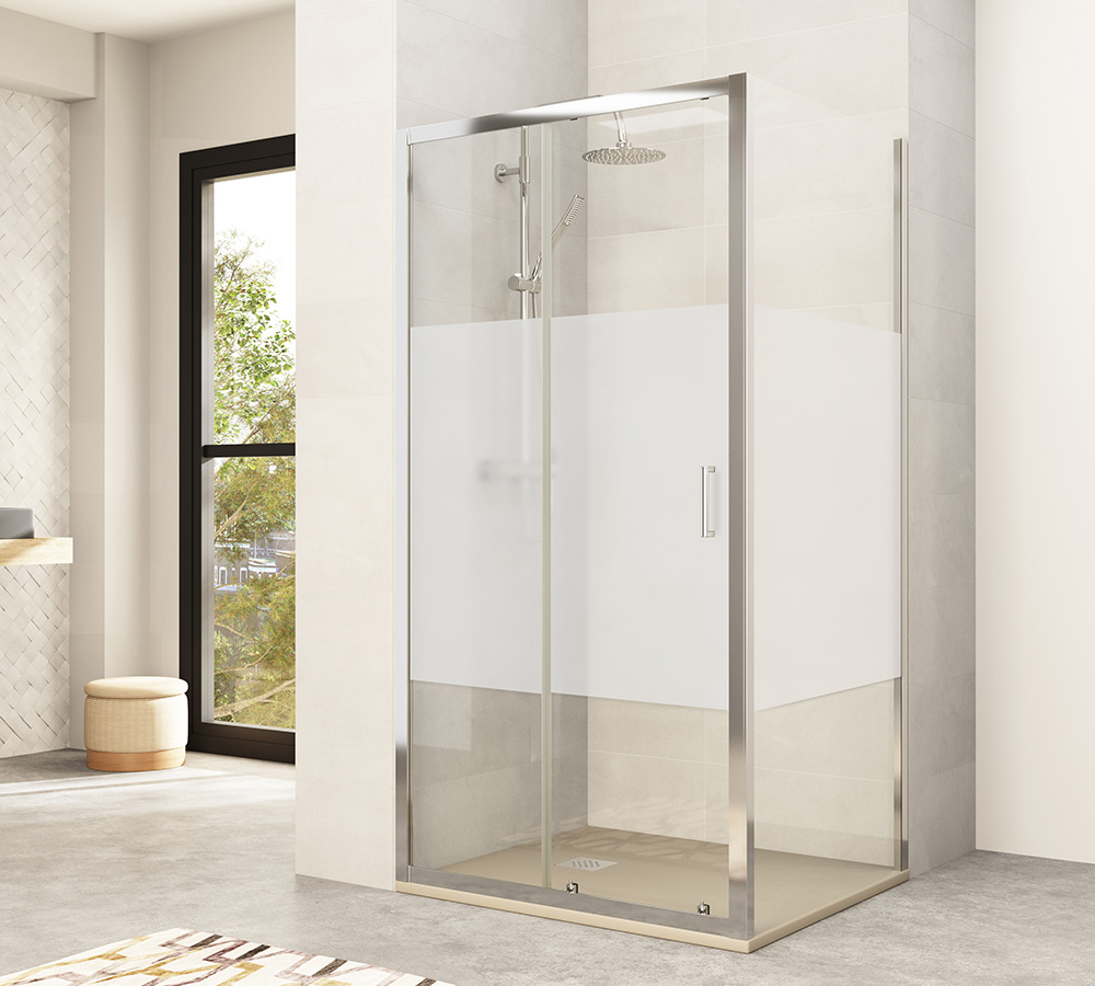 Fabricado em alumínio liga 6063, com acabamento cromado e perfilaria completa. O vidro é temperado de 5 mm e tratado com sistema anti-calcário Fast Clean em ambas as faces. Disponível em versão transparente ou com serigrafia ao ácido.
