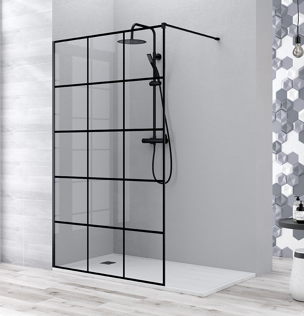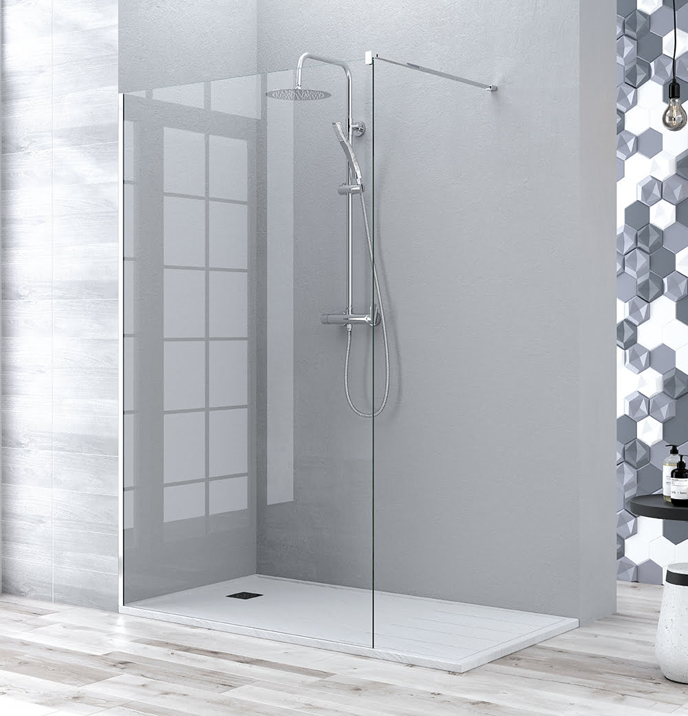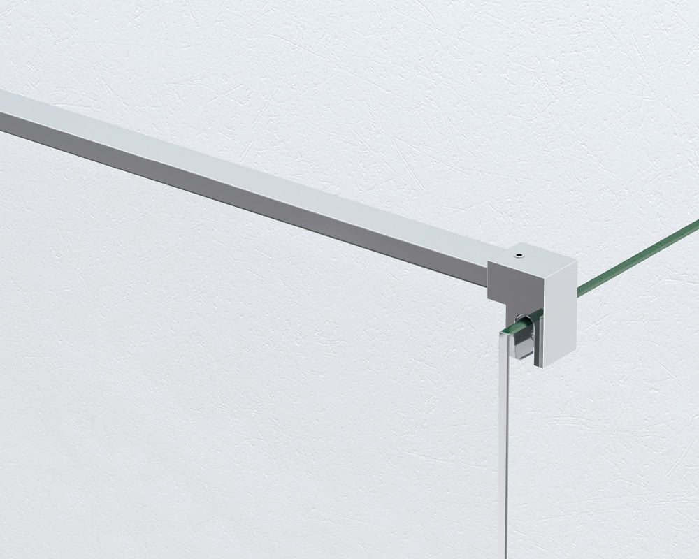Resguardo de duche elegante e funcional com vidro temperado de 8 mm, tratado com sistema anti-calcário Fast Clean em ambas as faces.